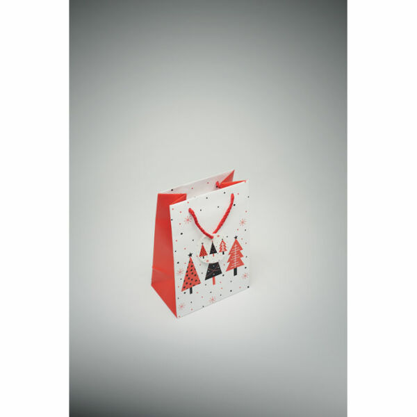 Papieren geschenktasje voor kerst (30% gerecycled) met label. Klein formaat. 128g/m² FSC®-certified | FSC MIX, W5.3, FSC-C213206Papieren geschenktas…
