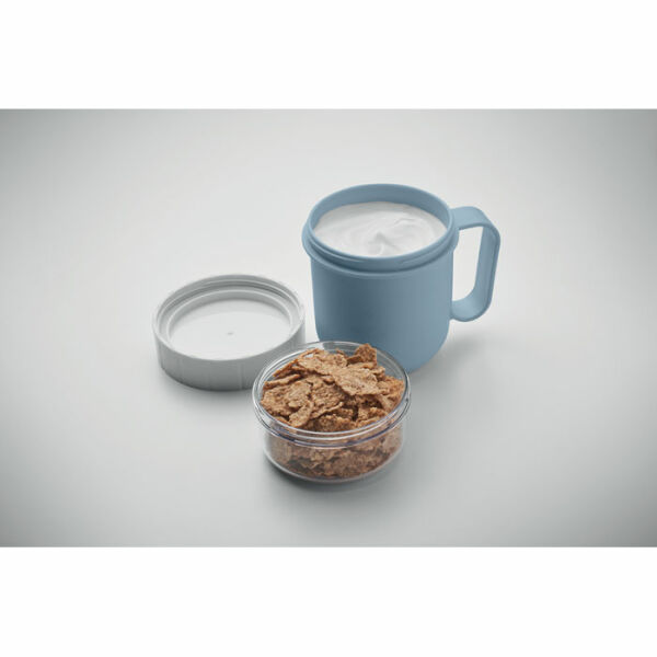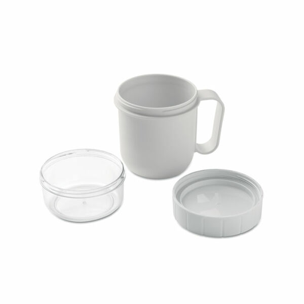 Ontbijt- of brunchbeker voor onderweg in PP- en PS-deksel. Bestaat uit 2 individuele bakjes om ingrediënten apart te houden. Inhoud : 450ml en 160ml. Lekvrij.